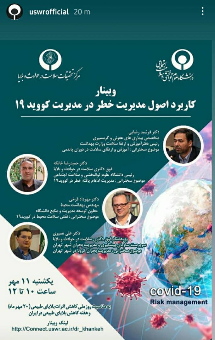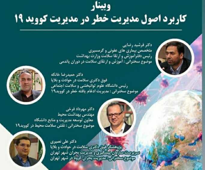 برگزاری وبینار کاربرد اصول مدیریت خطر در مدیریت کووید-19 مرکز تحقیقات سلامت در حوادث و بلایا به مناسبت روز ملی کاهش اثرات بلایای طبیعی ، وبینار کاربرد اصول مدیریت خطر در مدیریت کووید-19 را برگزار می کند. به اطلاع کلیه اعضای محترم هیات علمی، پژوهشگران و علاقمندان می رساند مرکز تحقیقات سلامت در حوادث و بلایا به مناسبت روز ملی کاهش اثرات بلایای طبیعی (بیستم مهرماه) و هفته کاهش بلایای طبیعی ، وبینار : کاربرد اصول مدیریت خطر در مدیریت کووید-19 را برگزار می کند. روز برگزاری: یکشنبه 11 مهرماه ساعت 10 الی 12