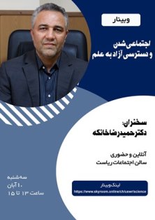 برگزاری وبینار اجتماعی شدن و دسترسی آزاد به علم وبینار اجتماعی شدن و دسترسی آزاد به علم در تاریخ سه شنبه 10 آّبان ماه برگزار می شود. به اطلاع کلیه اعضای محترم هیات علمی، دانشجویان گرامی و سایر علاقمندان می رساند وبینار : اجتماعی شدن و دسترسی آزاد به علم، در تاریخ سه شنبه 10 آبان ماه ساعت 13 الی 15 با سخنرانی آقای دکتر حمیدرضا خانکه به صورت مجازی و حضوری در دفتر ریاست دانشگاه علوم توانبخشی و سلامت اجتماعی برگزار می گردد. آدرس جهت شرکت در وبینار: https:www.skyroom.online/ch/uswr/science