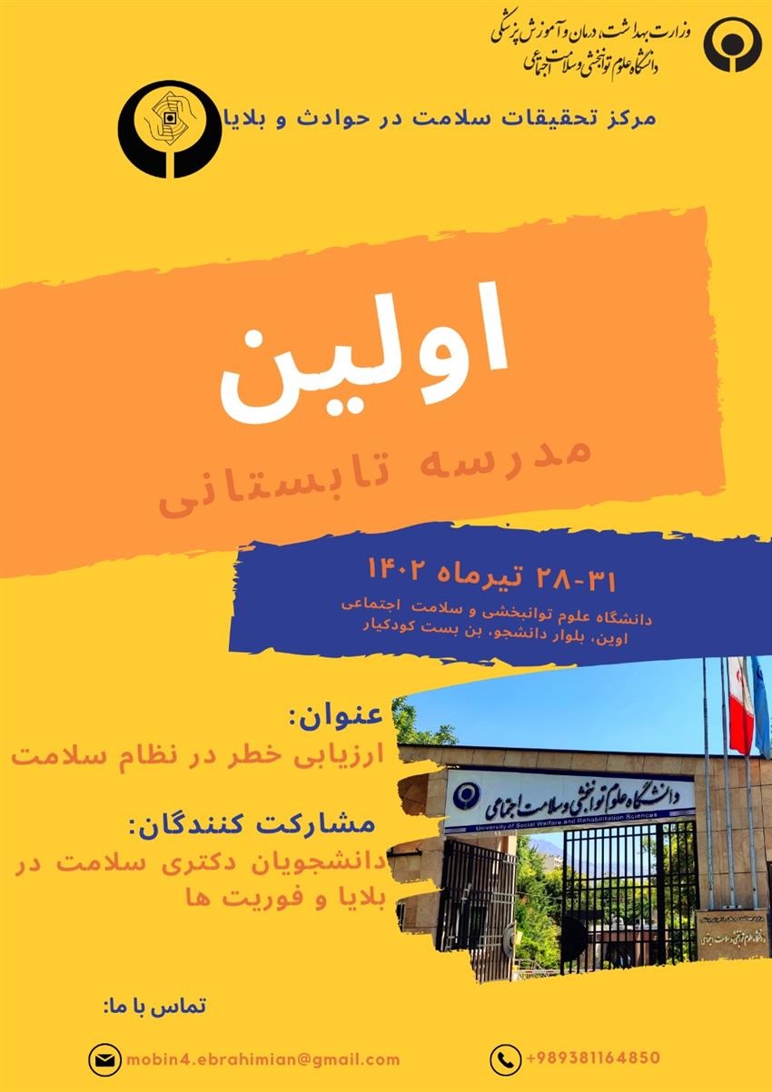 به اطلاع دانشجویان گرامی می رساند نظر به برگزاري اولين مدرسه تابستاني ارزيابي خطر در نظام سلامت توسط مركز تحقيقات سلامت در حوادث و بلايا دانشگاه، جهت ثبت نام به پوستر همايش که پیوست می باشد، مراجعه فرمایید.