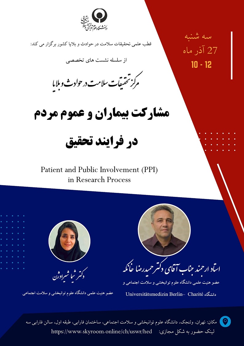 سلسله نشست های تخصصی مرکز تحقیقات سلامت در حوادث و بلایا برگزاری نشست آذر ماه از سری سلسله نشست های تخصصی مرکز تحقیقات سلامت در حوادث و بلایا به اطلاع کلیه اساتید ارجمند، دانشجویان گرامی و تمامی علاقه مندان می رساند نشست تخصصی مشارکت بیماران و عموم مردم در فرایند تحقیق با سخنرانی آقای دکتر حمیدرضا خانکه و سرکار خانم دکتر شیما شیراوژن در تاریخ سه شنبه 27 آذر ماه 1403 ساعت 10 الی 12 در دانشگاه علوم توانبخشی و سلامت اجتماعی، ساختمان فارابی، فارابی 3 برگزار می گردد. قدردان حضور ارزشمندتان هستیم. لینک حضور مجازی https://www.skyroom.online/ch/uswr/hed