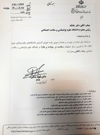به استناد رای صادره دویست و پنجاه و سومین جلسه شورای گسترش دانشگاههای علوم پزشکی مورخ 1395/02/26 با تاسیس مرکز تحقیقات سلامت در حوادث وبلایا موافقت اصولی بشماره 500/987/ د مورخ 1395/03/18 شده و به استناد رای صادره در دویست و هشتاد و دومین جلسه شورای گسترش مورخ سوم خرداد 1400 با تاسیس مرکز تحقیقات سلامت در حوادث و بلایا موافقت قطعی بعمل آمد.